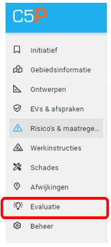 Na het afronden van de uitvoeringsfase draagt de grondroerder C5P over aan de initiatiefnemer. Afhankelijk van het project kan de doorlooptijd erg lang zijn en kunnen er veel personen betrokken zijn bij het proces van zorgvuldig graven. Het is voorstelbaar dat evaluatiepunten gedurende zo’n langdurig proces vergeten gaan worden. Om die kans te verkleinen en het de initiatiefnemer mogelijk te maken een zinvolle evaluatie te houden, wordt in de C5P app data voor deze evaluatie automatisch verzameld. Er is op deze tabbladen ook ruimte gemaakt om zelf evaluatiepunten te noteren. Het is zinvol om hier ook vast een “verbeter voorstel of verbeter richting” te beschrijven. Dit kan in alle project fasen.