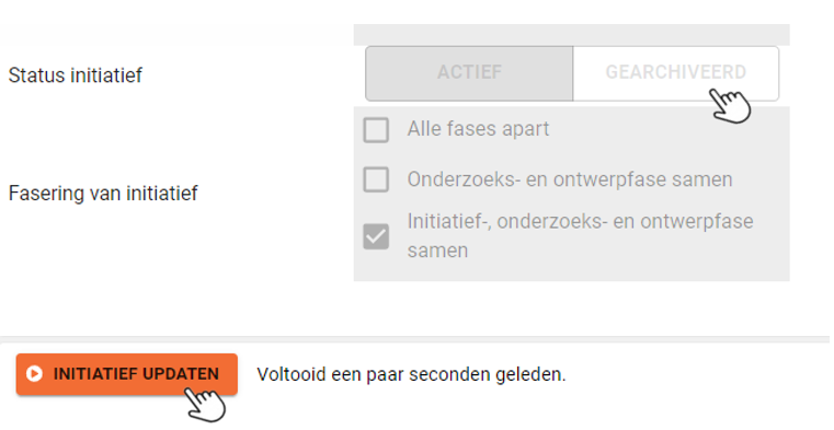 Als een initiatief gereed is wordt het gearchiveerd middels de knop “gearchiveerd” en daarna klik je op “INITIATIEF UPDATEN” (zie afbeelding hieronder).