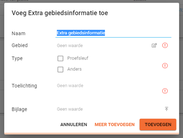 Op deze plek kan je extra gebiedsinformatie uploaden, zoals bijvoorbeeld informatie verkregen uit proefsleuven of grondradar onderzoek. Maar ook gebiedsinformatie over “bommen en granaten”, zakkende grond etc..