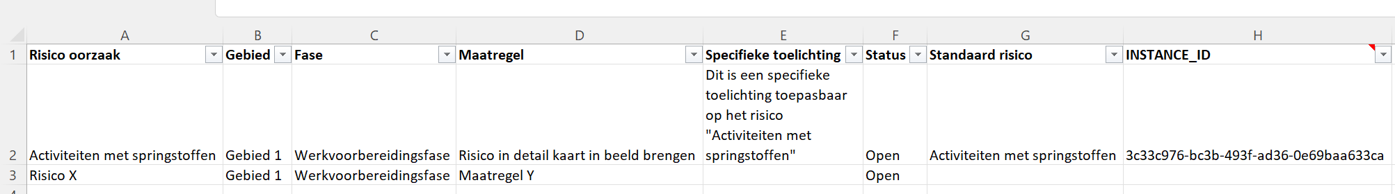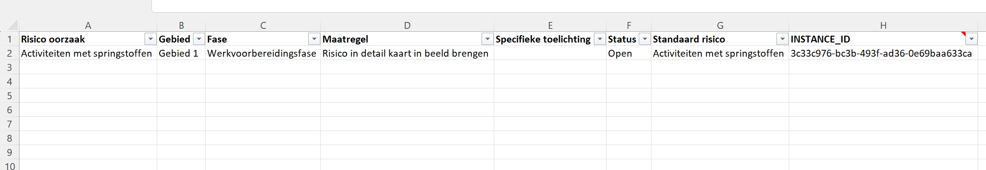 De kolm INSTANCE_ID is noodzakelijk om bestaande regels in de Risico en maatregelen tabel te kunnen overschrijven. Verwijder deze kolom nooit! Indien je nieuwe regels wilt toevoegen mag de waarde in deze kolom wel leeg zijn.