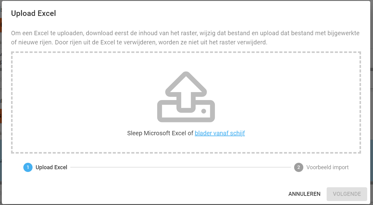 Na het klikken op de knop “Importeer vanuit Excel” krijgt u een pop-up met hierin een upload veld. Sleep het Excel bestand hierin. Klik vervolgens op “Volgende”.