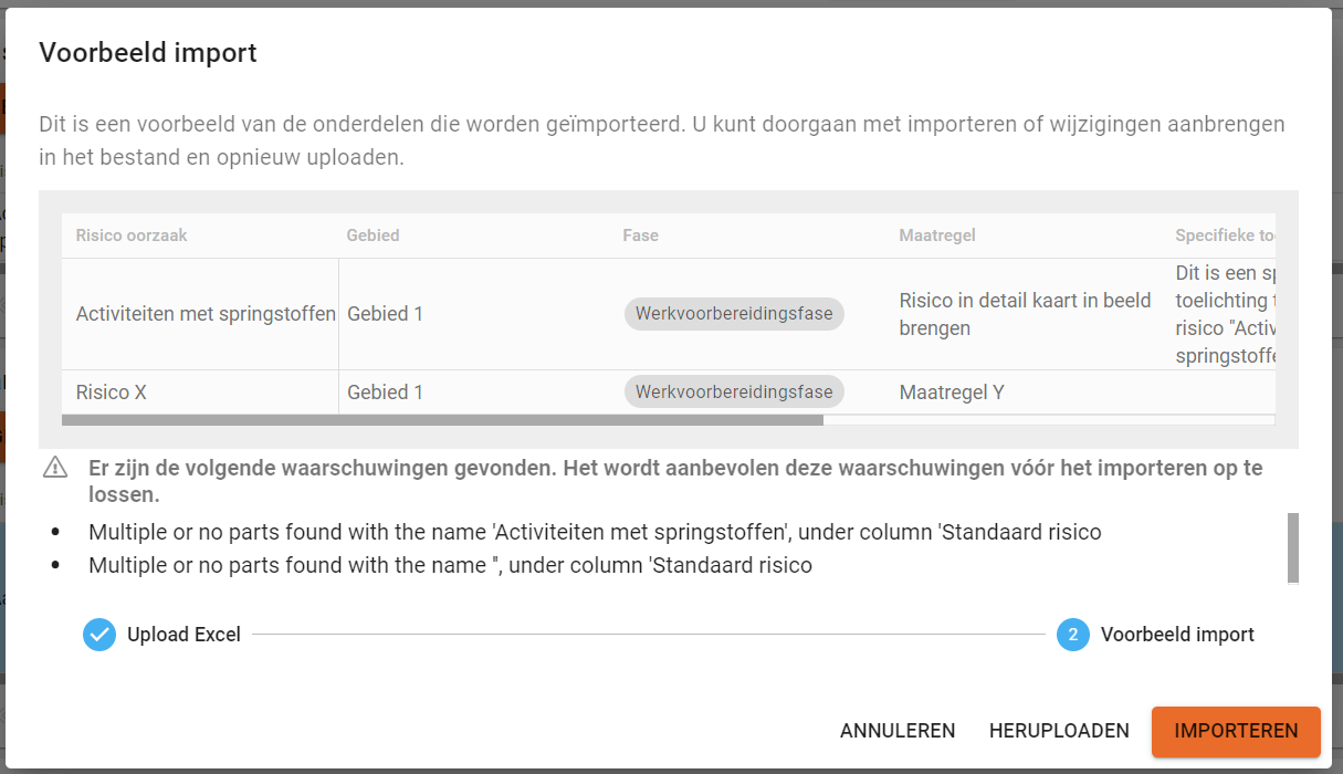 Nu krijgt u een voorbeeld te zien van de tabel in de C5P app. Het kan zijn dat er waarschuwingen zijn indien er geen unieke match is met bijvoorbeeld een referentie naar een standaard risico óf een item uit een selectielijst. Dit hoeft niet erg te zijn. Missende informatie kunt u altijd in de C5P app aanvullen. Bevestig door te klikken op “Importeren”.