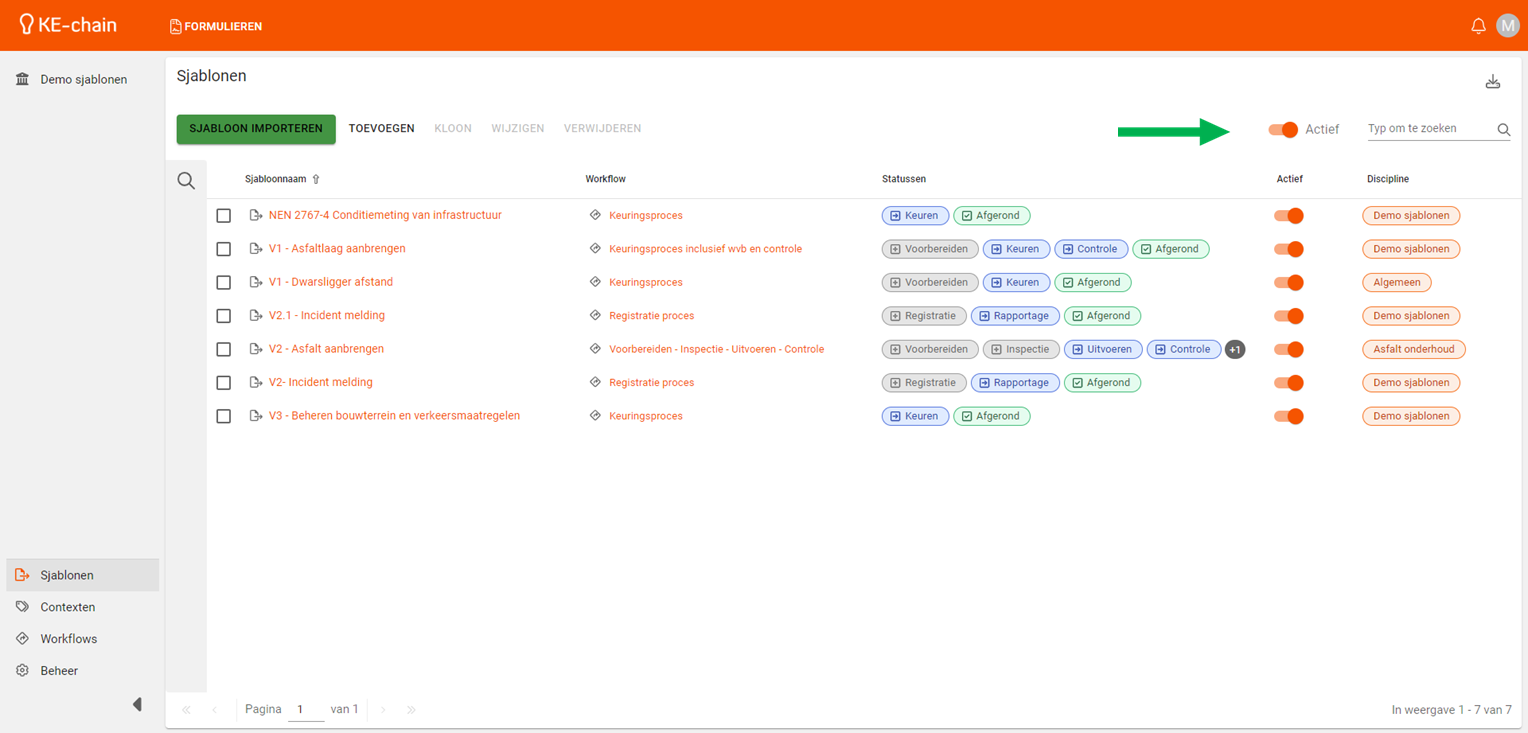 Tip: Koppel standaardcontexten (zoals discipline) toe aan de sjablonen. Bij het importeren van een sjabloon naar een project worden deze automatisch meegenomen, evenals de workflow waaraan het sjabloon is gekoppeld.