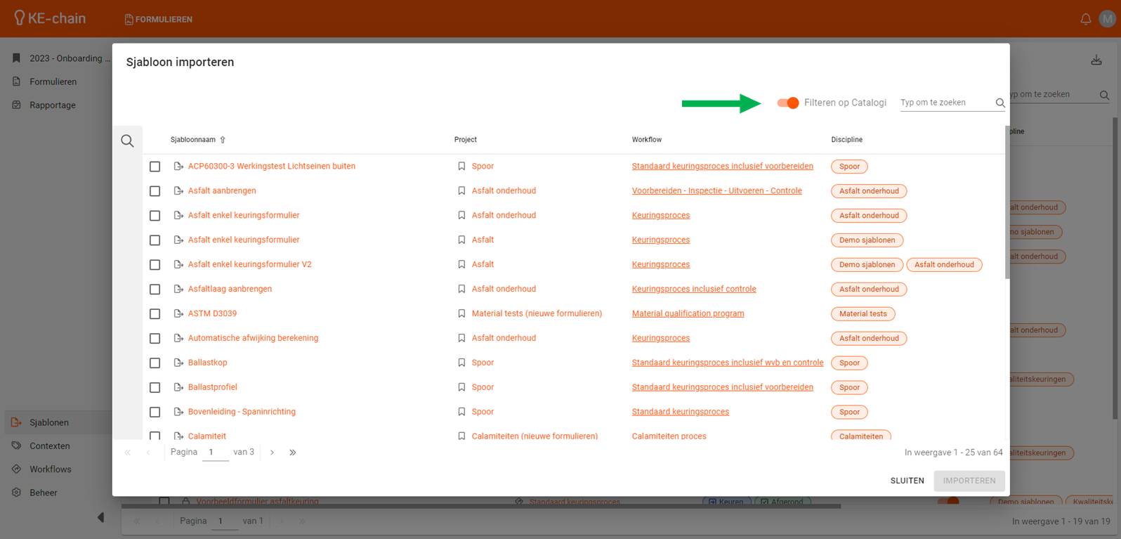 Door de voorfilter zie je in eerste instantie alleen de sjablonen die beschikbaar zijn gesteld in de verschillende catalogi waar jij als gebruiker aan bent toegekend. Door deze filter uit te schakelen krijg je ook toegang tot de sjablonen uit andere projecten (waar jij aan bent toegekend).