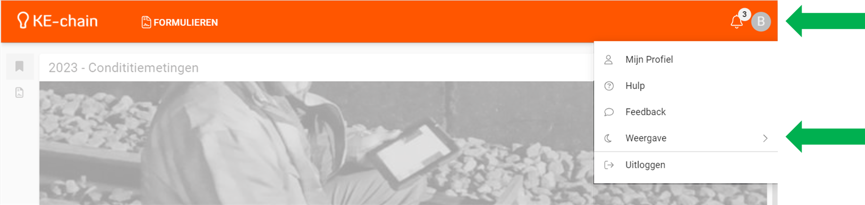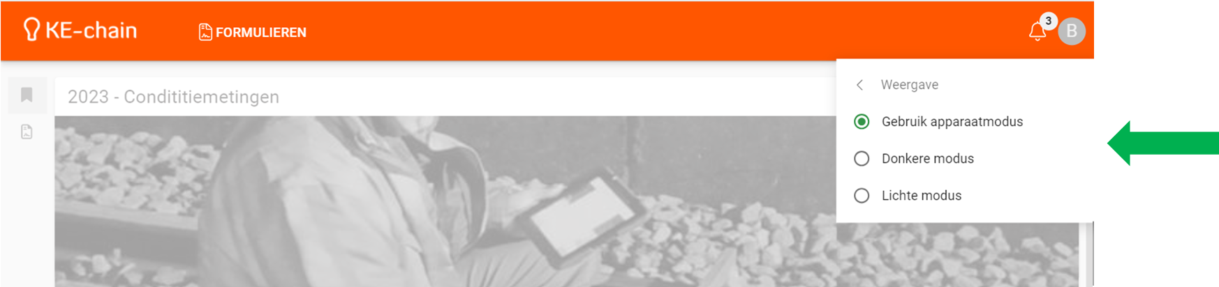 Dark mode is een functie in KE-chain om de achtergrondkleuren van de interface te veranderen. In de donkere modus worden de achtergronden donkerder en de tekst en pictogrammen lichter. Dit helpt om de interface makkelijker voor je ogen te maken, vooral als je de software 's nachts of in een omgeving met weinig licht gebruikt. Je kunt kiezen tussen de donkere modus, de lichte modus (standaardweergave) en apparaatmodus (gebruikt de voorkeuren van je apparaat).