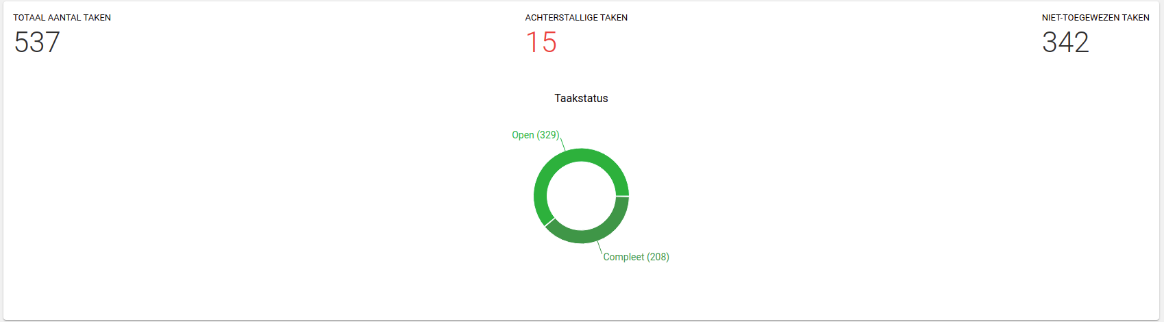 Het dashboard toont het totaal aantal taken, en het percentage van deze taken dat open of compleet is. Verder is te zien hoeveel taken er achterstallig zijn: taken waarbij de opleveringsdatum gepasseerd is, en de hoeveel taken er niet toegewezen zijn: taken waar geen gebruiekrs aan zijn toegezen.