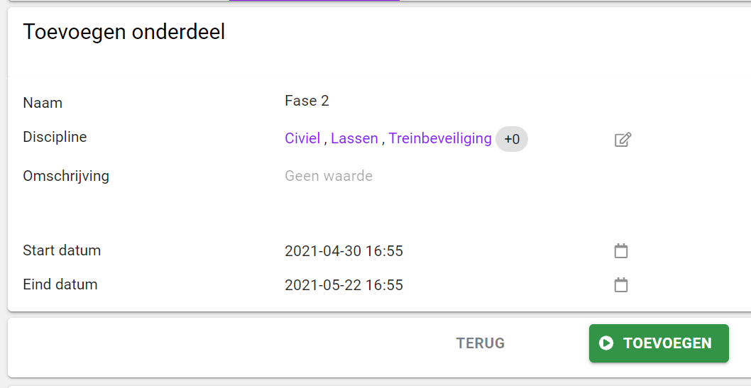 Het is nu mogelijk om bij het toevoegen van een onderdeel of object aan te geven voor welke discipline of disciplines dit onderdeel of object gebruikt kan worden. Het specificeren van de gekoppelde discplines kan helpen in het filteren op onderdelen of objecten welke gekoppeld kunnen worden aan formulieren van verschillende disciplines. Handig voor het maken van integrate project rapportages over meerdere disciplines heen in de context van een onderdeel of object!
