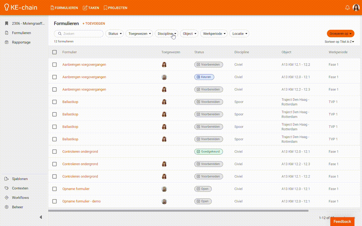 Door te groeperen is het mogelijk om voor meerdere contextgroepen, bijvoorbeeld op basis van Discipline en Werkpakket, formulieren te bundelen. Voor elke groep met een gemeenschappelijke context wordt de voortgang berekend op basis van het aantal “openstaande”, “in uitvoering” of “afgeronde” formulieren. Dit geeft gelijk een relevante status van de projectvoortgang voor planners en werkvoorbereiders.