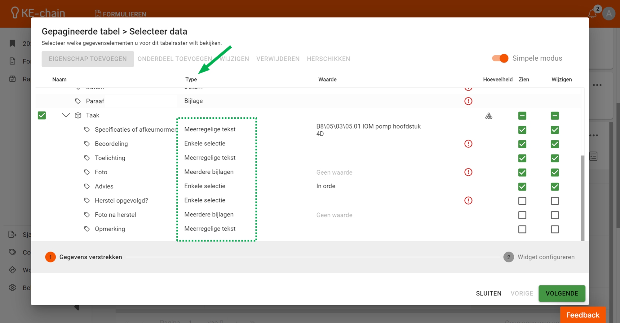 In gegevens verstrekken bij widget bewerken is een kolom toegevoegd met eigenschap type.