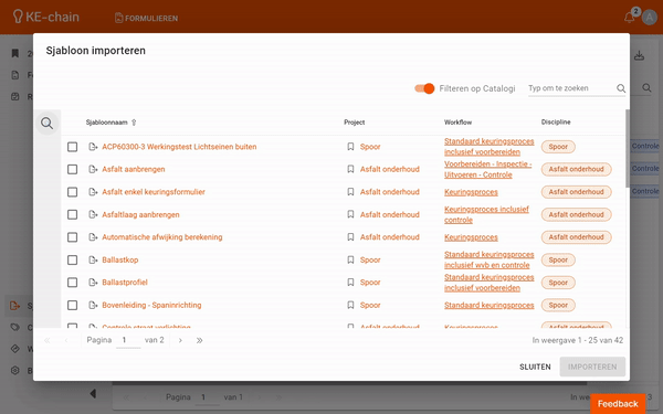 Bij het importeren van sjablonen naar een project is een filter toegevoegd waarbij je kunt voorfilteren op sjablonen uit catalogi. Deze filter staat standaard aan, maar kan altijd uitgezet worden indien je een sjabloon uit een specifiek project wilt importeren.