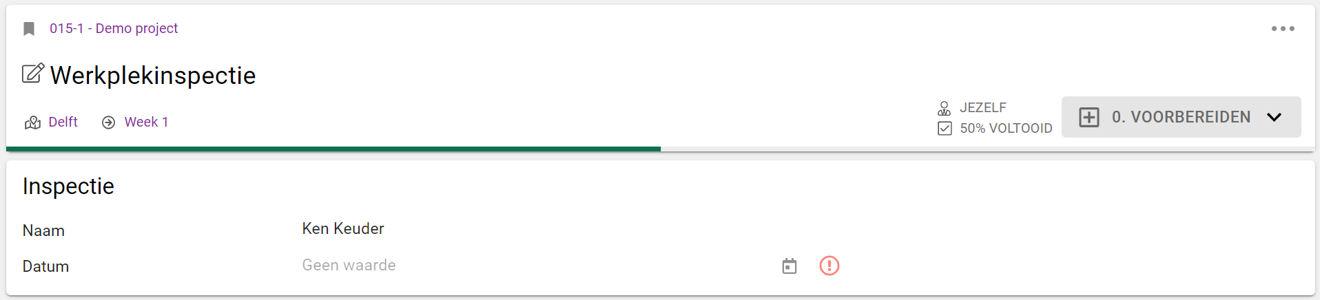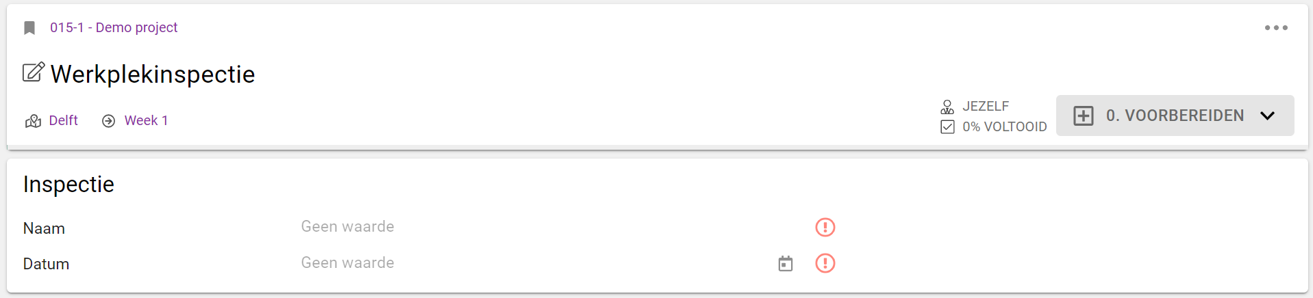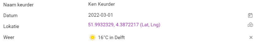 Wijzigbare velden zijn wit kan kleur kan je invullen. Er zijn verschillende type eigenschappen zoals: tekst, getallen, enkele of meerdere selectielijsten, locatie, datum, datum/tijd, weerinformatie, bijlage en meer. Zie Formulieren invullen voor meer informatie.