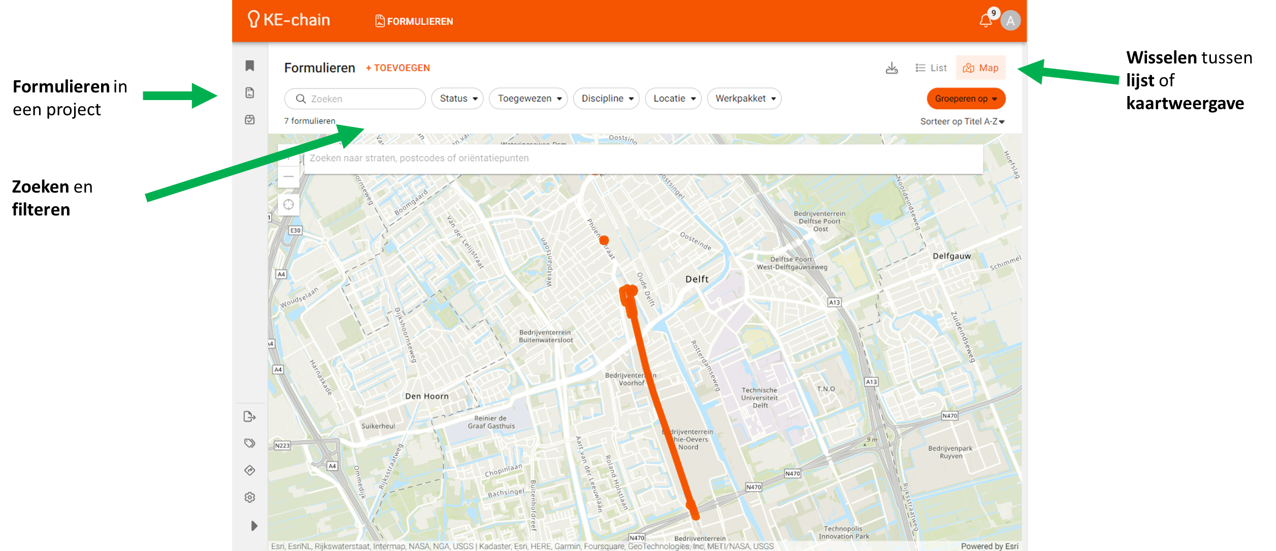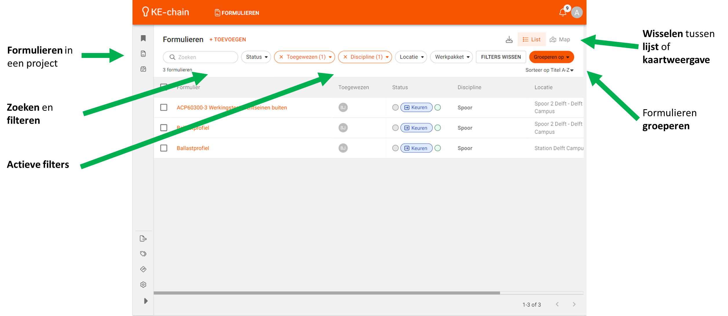 Je vindt al jouw formulieren via de knop ‘Formulieren’ in het topmenu van KE-chain. Hier vind je alle formulieren die aan jou zijn toegewezen, die zich op dat moment in de actieve formulierstatus bevinden. Op het moment dat je jouw werk hebt afgerond en het formulier doorgeeft aan de volgende status, verdwijnt deze dus ook uit dit overzicht. Deze lijst kan ook wel gezien worden als de ‘to-do list’ over alle projecten waarin je actief bent.