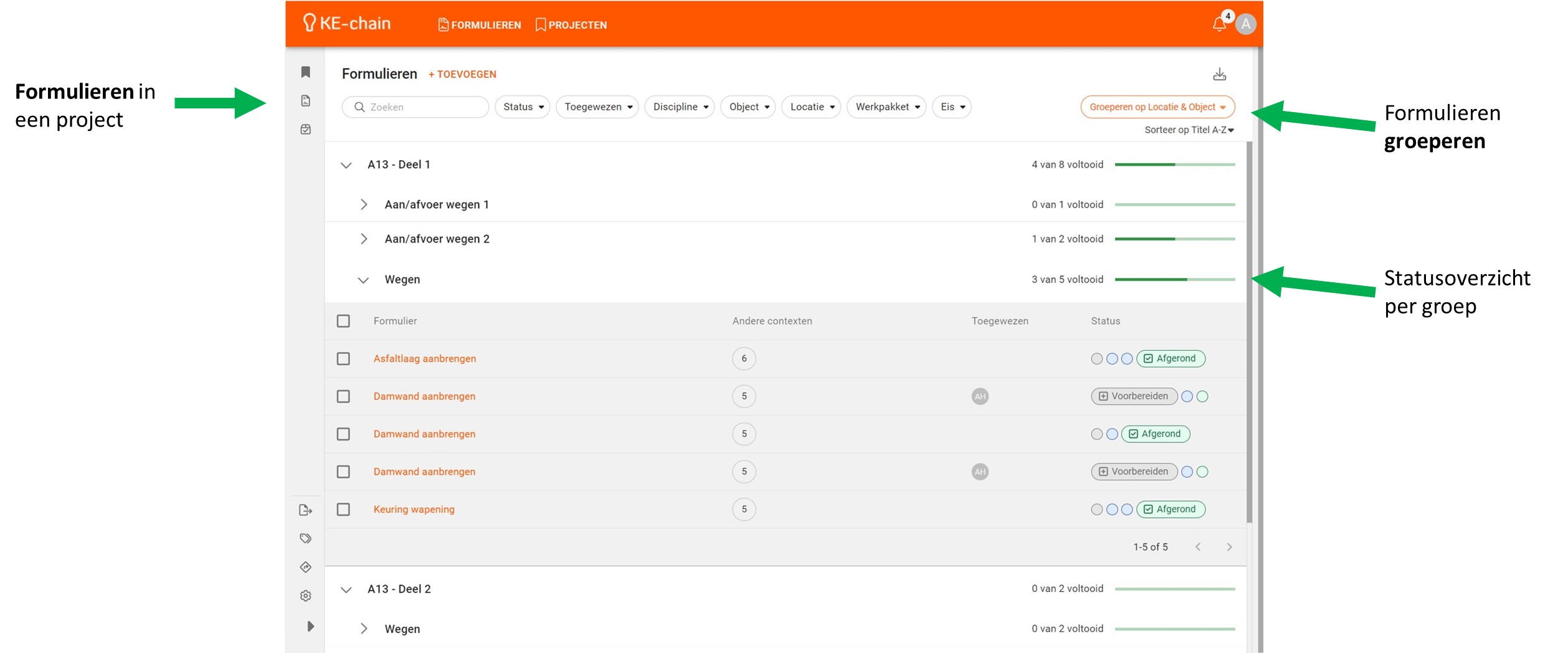 Rechts van de filters zit een knop ‘groeperen’. Je kan op twee niveau’s diep groeperen op basis van contexten. Op deze manier kan je eenvoudig overzicht creëren voor bijv. alle formulieren die zijn toegekend aan een discipline (niveau 1) en vervolgens per werkperiode. Het overzicht kan gebruikt worden om te sturen op voortgang van jouw project. Hier is een voorbeeld formulierenoverzicht met groepering toegepast op twee niveaus: