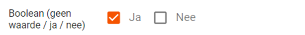 Boolean (geen waarde / ja / nee) | ![]() | Deze eigenschap is vergelijkbaar als de enkele selectie eigenschap. Het verschil is dat de selecties in dit geval vooraf bepaald zijn (geen / ja / nee). Wilt u dus andere selecties opstellen, zult u gebruik moeten maken van de enkele selectie eigenschap. |