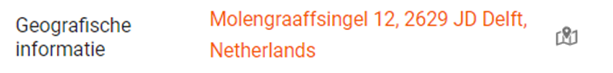 Geografische informatie | ![]() | De geografische informatie eigenschap wordt gebruikt voor locatie-aanduidingen. Door op het icoontje van de map te klikken, opent de kaart en kunt u een punt vastzetten voor de locatie. Hierin kunt u aangeven of het adres uitgeschreven moet worden of er een andere notatie van wilt maken (coördinaten). Kan geregistreerd worden volgens: