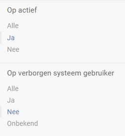 Als je een overzicht wil zien van je eigen gebruikers kan dit door de “verborgen systeem gebruikers“ uit te schakelen door aan de rechterzijde in de filters “Op actief“ op “Ja“ te zetten en “Op verborgen systeem gebruiker“ op “Nee“ te zetten.