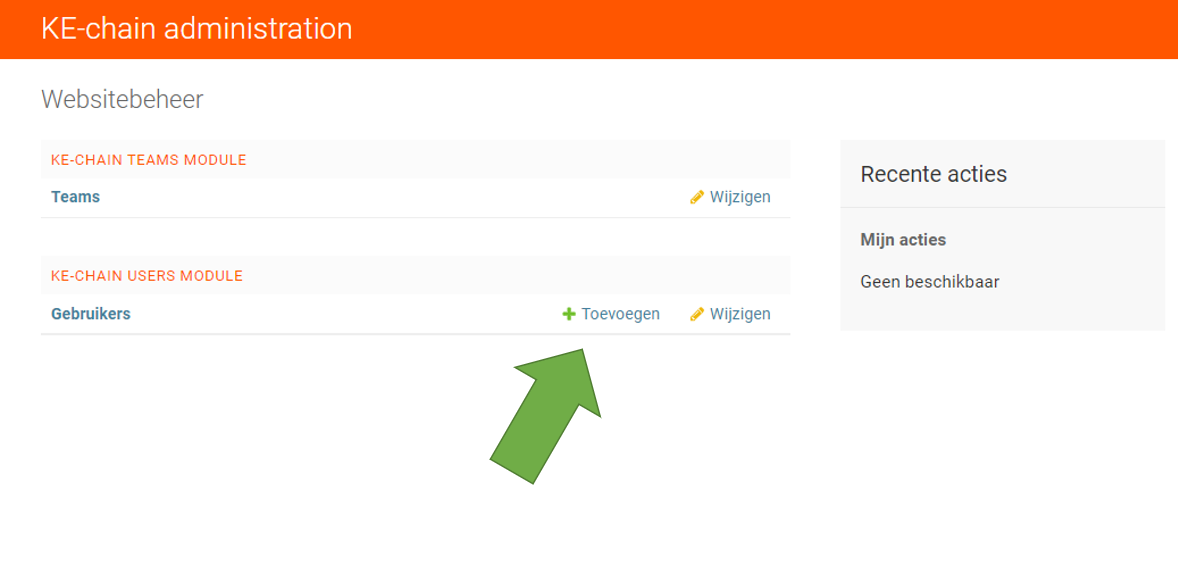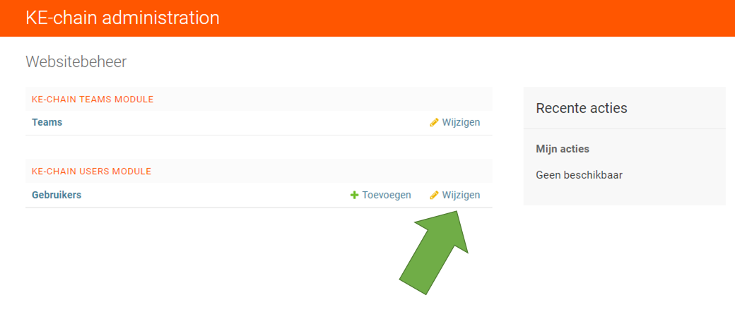 Ga terug naar de landingspagina van de beheeromgeving door de klikken op “Thuis“ links bovenin onder “KE-chain administration“. Of pas de URL aan naar [jouw-url].ke-chain.com/admin/.