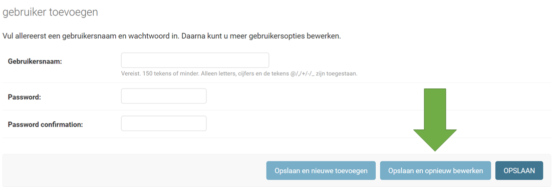 Je voegt dan de gebruikersnaam toe. Dan is een aaneengeslotennaam, dus zonder spaties. Ook voeg je hier een wachtwoord toe. Dit wachtwoord kan de gebruiker zelf later aanpassen. Sla het dan op door te klikken op de middelste knop “Opslaan en opnieuw bewerken“. Je kan dan namelijk gelijk de andere details van de gebruiker toevoegen.