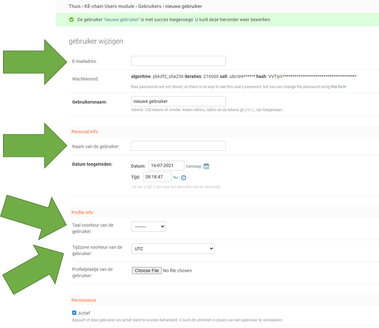 Als je dat hebt gedaan kom je in het detailoverzicht van deze gebruiker terecht. Daar zijn er vier zaken waar je op moet letten als je de nieuwe gebruiker aanmaakt.