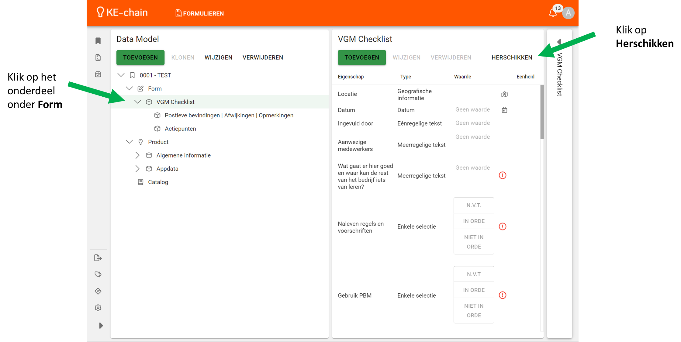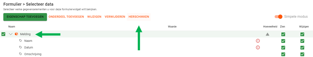 Selecteer het onderdeel (hieronder Melding) waar de eigenschappen aan gekoppeld zijn en klik op de knop Herschikken