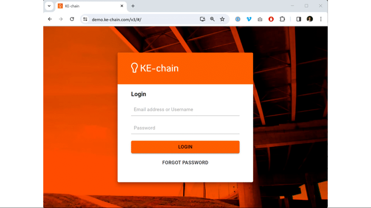 Navigeer naar jouw KE-chain website (https://<<mijn-omgeving>>.ke-chain.com) via de Google Chrome browser.