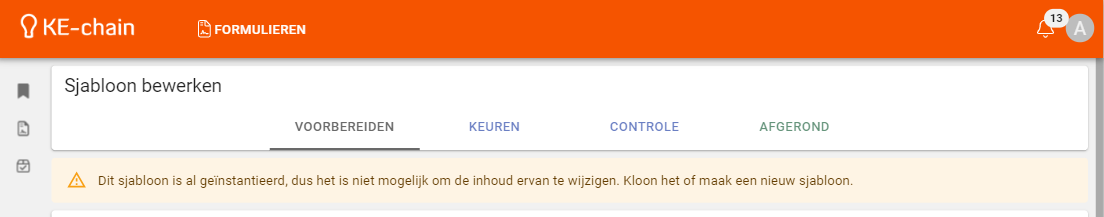 Wanneer een sjabloon al gebruikt wordt in formulieren zie je de volgende banner in het sjabloon