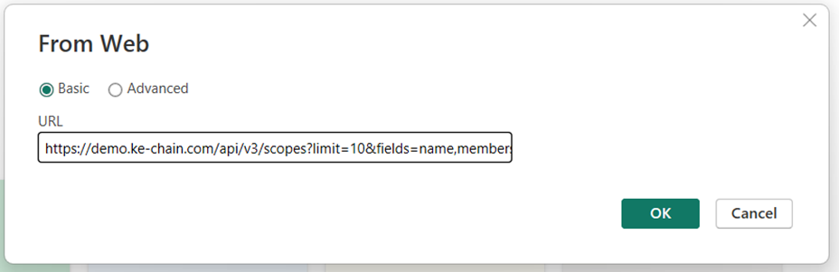 Een pop-up zal openen om een URL in te voeren. Bouw hier de API op om projecten en gebruikers op te halen. Dit ziet er als volgt uit: https://<<omgeving>>.ke-chain.com/api/v3/scopes?limit=10&fields=id,name,members&status=ACTIVE. Bevestig vervolgens met OK. Het is altijd later mogelijk om de limiet te verhogen (zie Data uitbreiden hoe je dat doet).