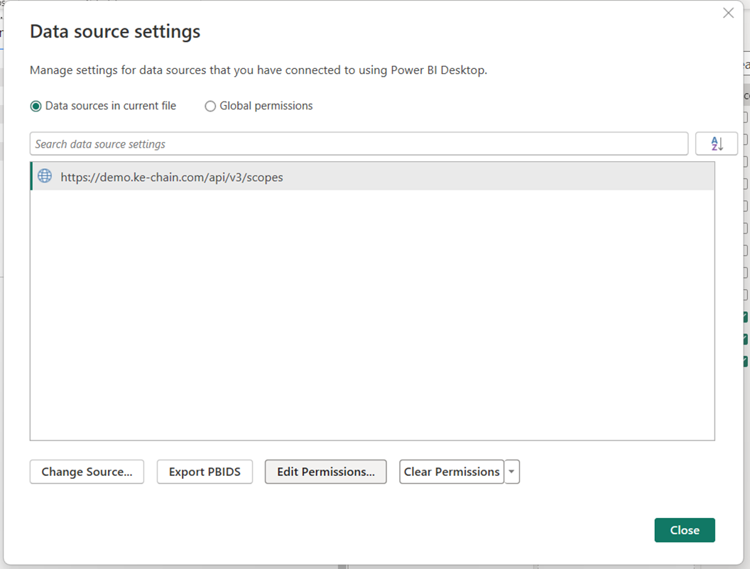 Klik op “Data source in current file” (of configurer configure global permissions als je een geadvanceerde gebruiker bent) en selecteer jouw bronnen één voor één.