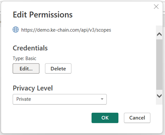 Om gebruik te kunnen maken van de de API moet de juiste authenticatie ingevoerd worden. Dit kan middels een token, of gebruikersnaam en wachtwoord. In PowerBI is het eenvoudig om authenticatie toe te voegen via “Data source settings”: