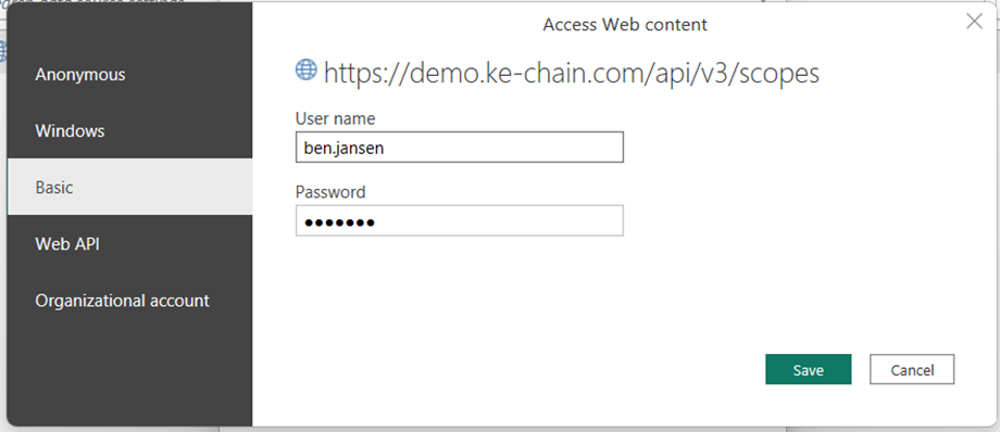 Gebruik jouw KE-chain username en wachtwoord. Bevestig met Save