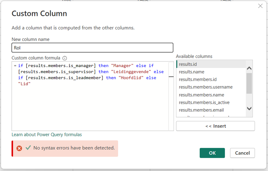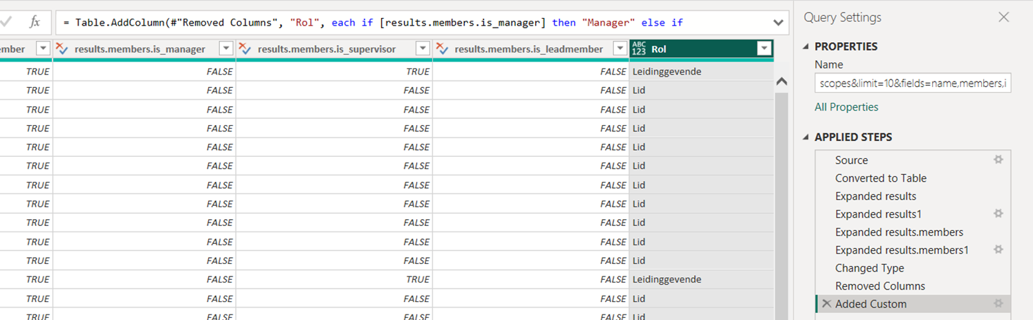 CODEif [results.members.is_manager] then "Manager" else if [results.members.is_supervisor] then "Leidinggevende" else if [results.members.is_leadmember] then "Hoofdlid" else "Lid"Bevestig met OK en zie het resultaat.