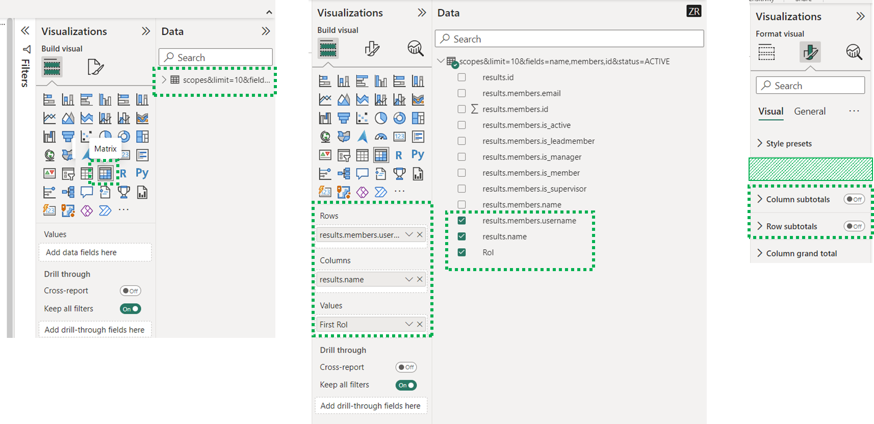 Bij visualizations, klik op Matrix. Selecteer de volgende gegevens: