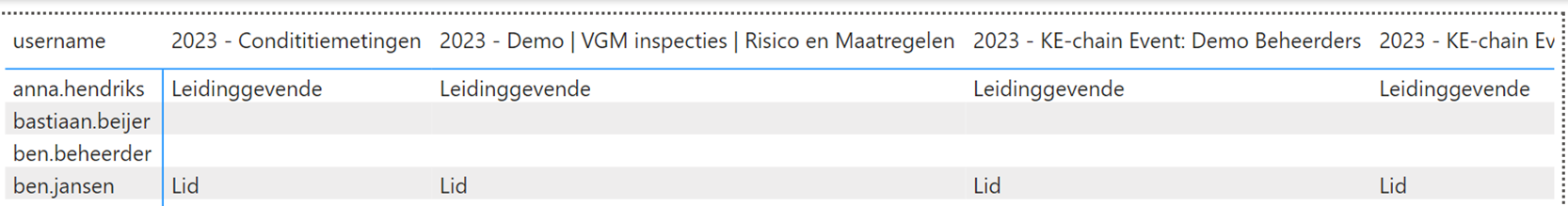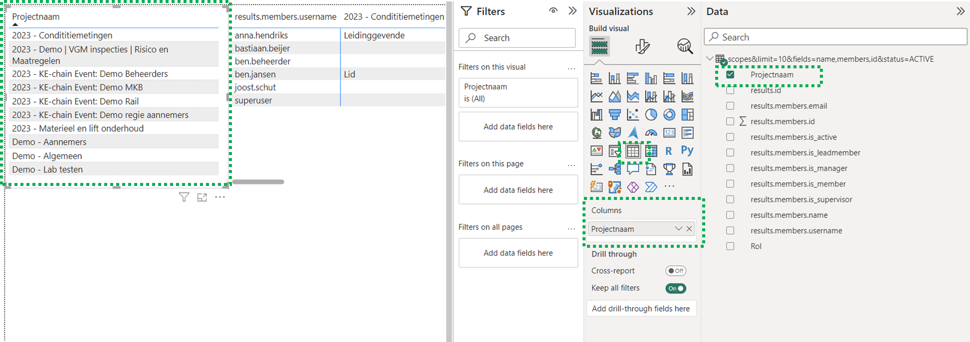 Nu we een data query hebben opgebouwd, kunnen we een passende visualisatie maken. We willen graag een combinatie maken van beschikbare projecten en een matrix van gebruikers met hun rol per project.