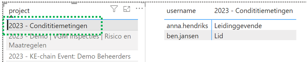 Om effectief te kunnen filteren op gebruikers en projecten voegen we nog een tabel toe met enkel de Projectnaam. In dit voorbeeld hebben we results.name hernoemd naar Projectnaam door met de rechtermuisknop te klikken op een dataveld en deze te hernoemen via Rename . Door de progressieve filters, kun je nu klikken op een projectnaam, waardoor de matrixtabel wordt aangepast met gebruikers per project. Vice versa, kun je nu klikken op een gebruikersnaam en komen alleen de toegewezen projecten terug in de linker tabel.