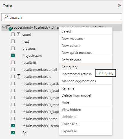 Let op dat er een fout kan optreden wanneer je de limit helemaal weghaald, omdat de ‘applied steps’ rekening houden met de velden count, next en previous. Dit is het gevolg van het toegepaste limiet. Je kunt dus beter een ruim limiet instellen, dan de limiet weghalen na het testen zodat je niet de data geheel opnieuw moet instellen.