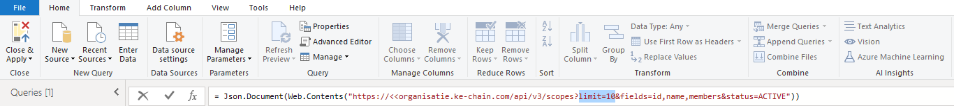 Wanneer je in een later stadium de limit wilt bewerken, kun je klikken op de data source en in de ‘Applied steps’ klikken op Source. Bij source kun je de API call aanpassen. Wanneer je limit aanpast blijven alle andere stappen in tact. Sluit de Power Query Editor opnieuw en herlaadt de data.