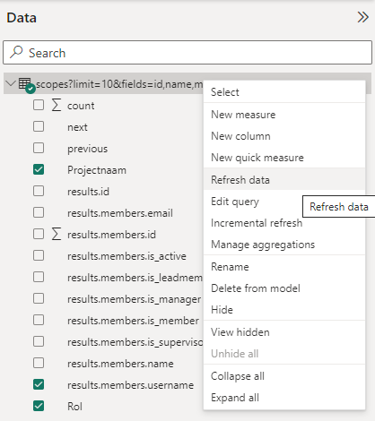 In dit voorbeeld gaan we via Power BI data opvragen om de projecten en gebruikers van jouw omgeving op te halen. Via de KE-chain API moeten we daarom de scopes bevragen. Enkele voorbeelden van de meestgebruikte API end-points zien er als volgt uit: