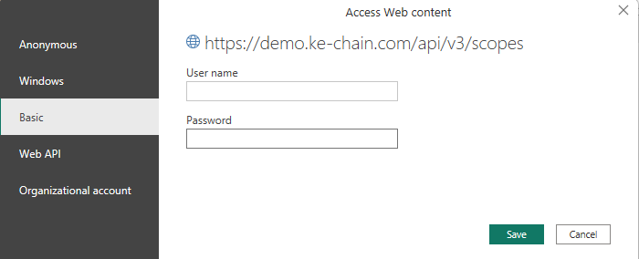 De wizard Access Web content wordt automatisch geopend. Klik op de knop in het zijmenu Basic om jouw KE-chain inloggegevens in te vullen. Dit ziet er als volgt uit: