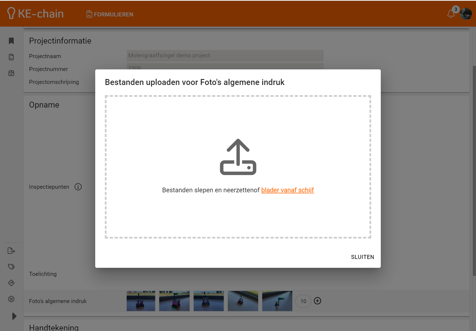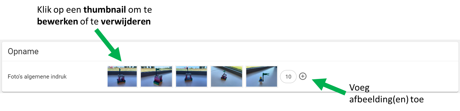 Voeg nieuwe afbeeldingen toe door op het plus-symbool te kliken. Afhankelijk van het device kun je bestanden slepen (op pc) of selecteren via foto bibliotheek (tablet of telefoon) of direct een foto nemen met de camera (tablet of telefoon). Voor meer informatie zie: Hoe werkt een bijlage eigenschap? .