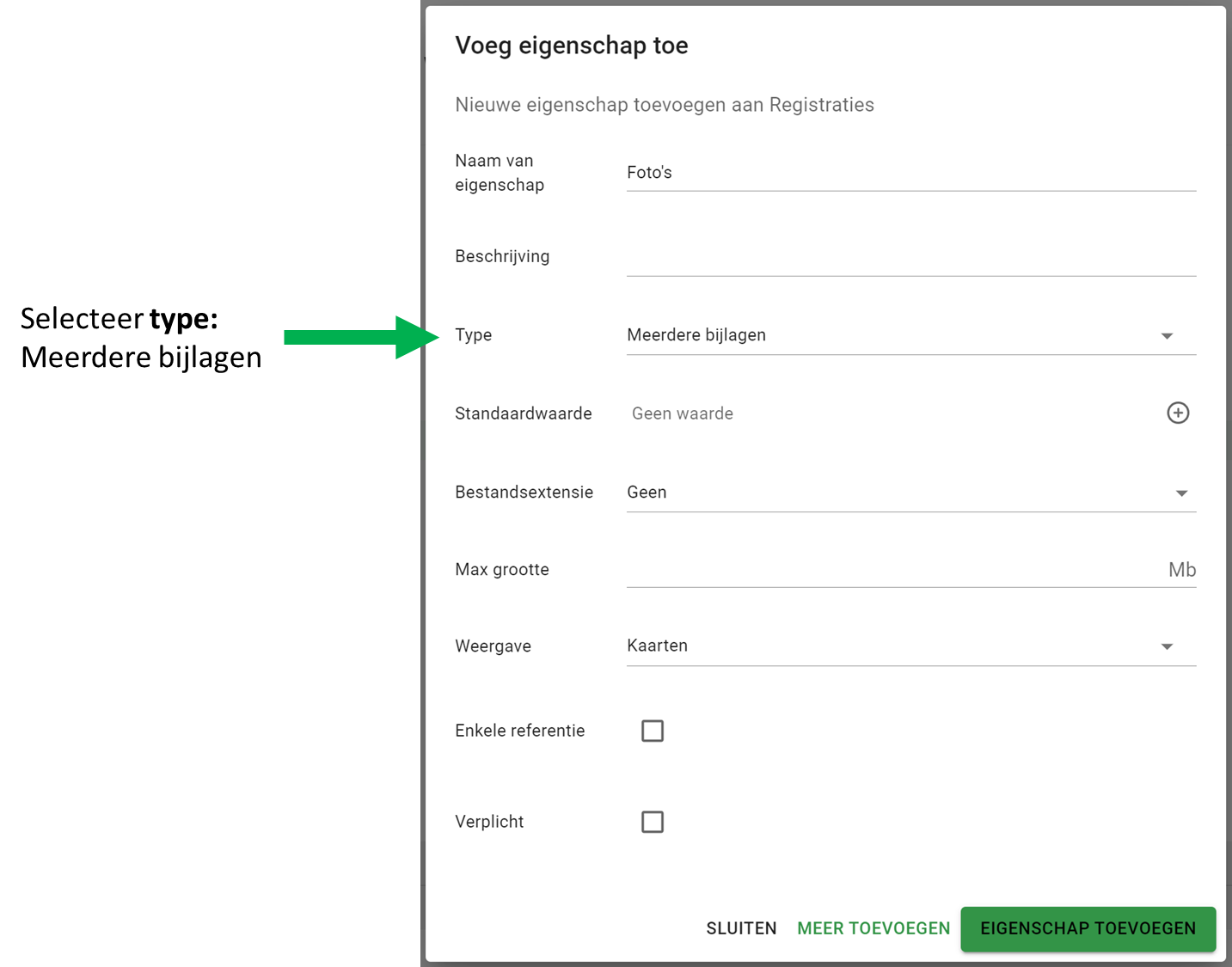 Naast het configureren van een bijlage eigenschap is het ook mogelijk om een meerdere bijlage eigenschap te configureren. Dit heeft als voordeel dat je onbeperkt bijlagen in één veld kunt toevoegen. Deze eigenschap is te configureren in zowel een formulieren widget als tabel widget.