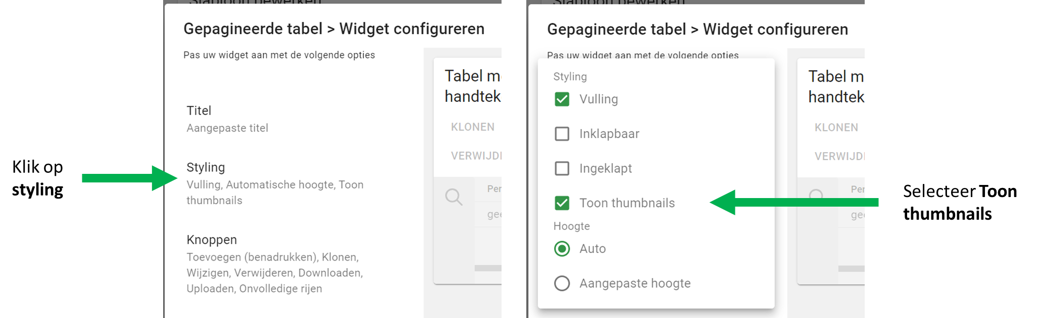 Configureer ‘toon thumbnails’ bij een tabel widget.