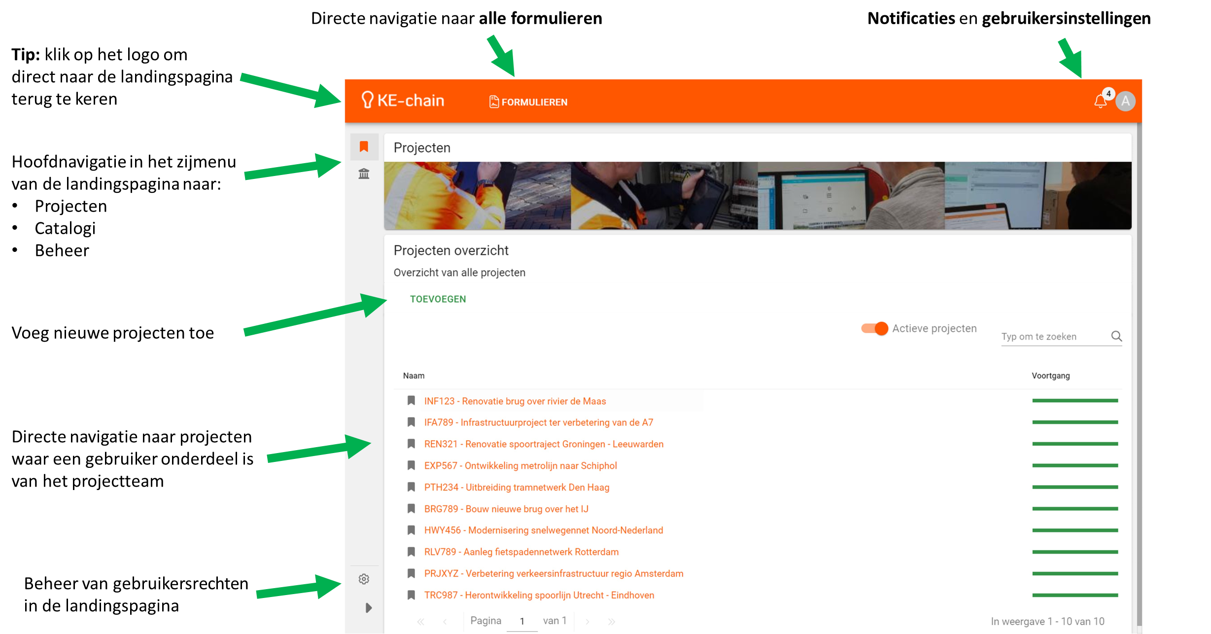 Gefeliciteerd! U bent ingelogd op de KE-chain Home-pagina van uw organisatie. Deze toelichting is bedoeld om u wegwijs te maken op deze landingspagina. Vanuit hier gaat u kunnen navigeren door KE-chain en is tevens de pagina waar u terechtkomt als u linksboven op het logo klikt. De Home-pagina is weergegeven in onderstaande afbeelding, daarnaast zijn de primaire functies aangegeven.