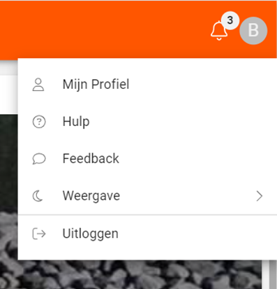 Naast de notificaties vind u de gebruikers instellingen. Bij gebruikersinstellingen vind u de mogelijkheid om een profiel in te stellen, naar hulp te gaan, de weergave aan te passen of uit te loggen. De gebruikersinstellingen hebben bevatten standaard de initialen van een gebruiker, of profielfoto indien deze is ingesteld.