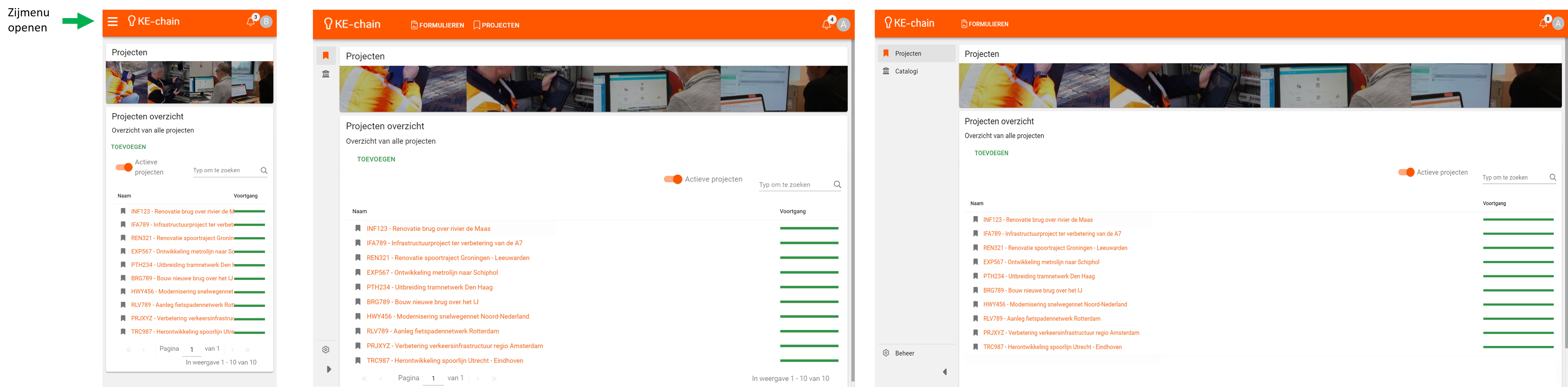 KE-chain weergave van het zijmenu op mobiel (links), tablet (midden) en desktop (rechts)