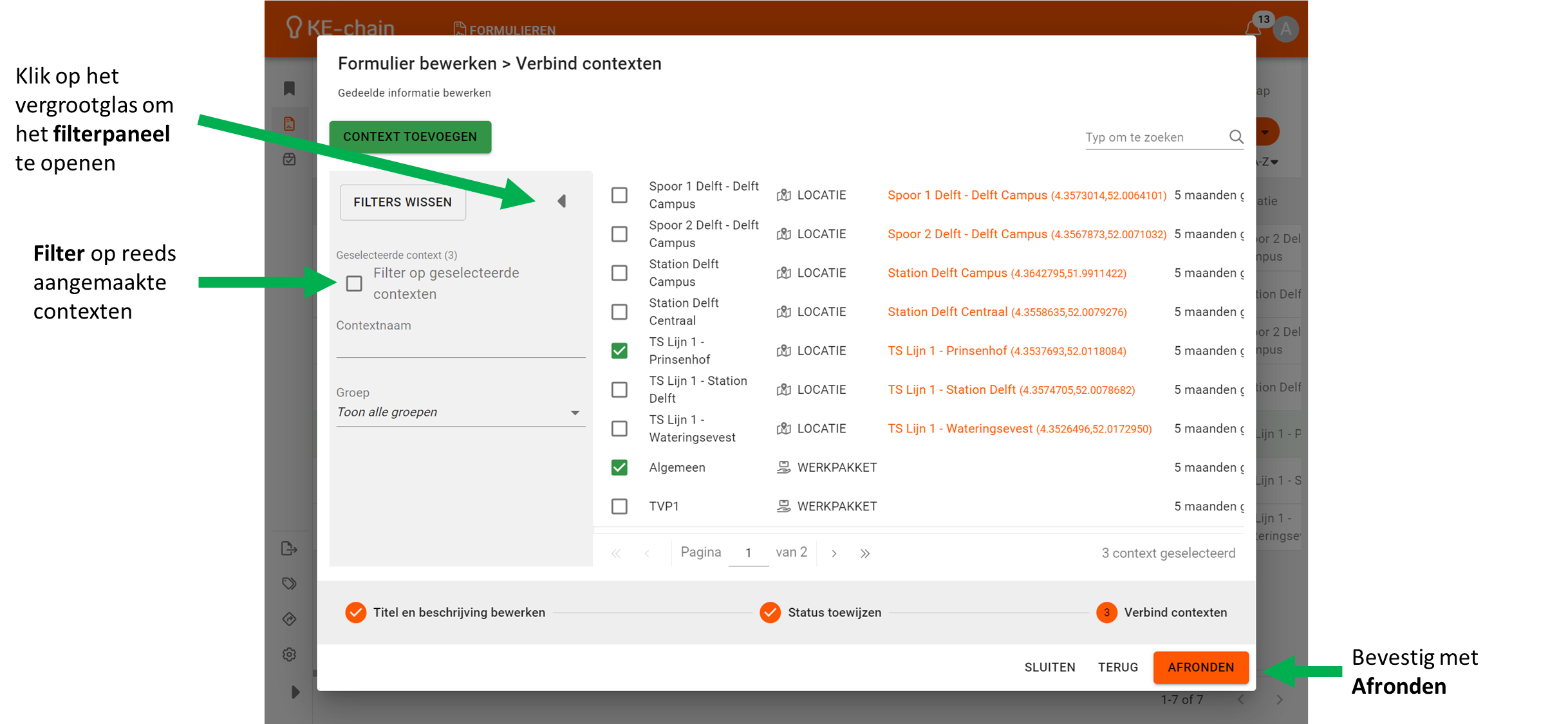Bij het verbinden van Contexten , kun je zoeken en filteren op contexten. Open het filterpaneel via het vergrootglas. Je kunt nu filteren op geselecteerde contexten om snel de huidige contexten te ontkoppelen. Hierna kun je een andere context selecteren, filter bijvoorbeeld op context groep “werkpakket”. Bevestig tot slot met Afronden.