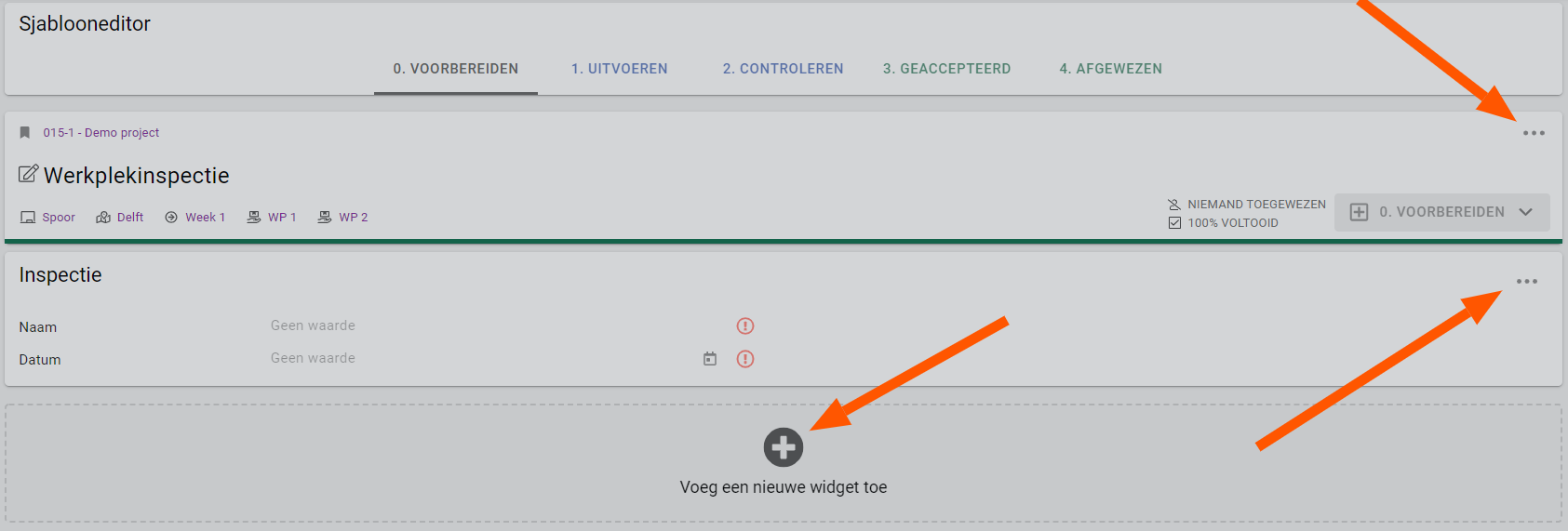 Deze inrichten moet je per status doen, stap in de workflow. Je kan wel makkelijk de widget uit de voorgaande status kopieren door te klikken op: