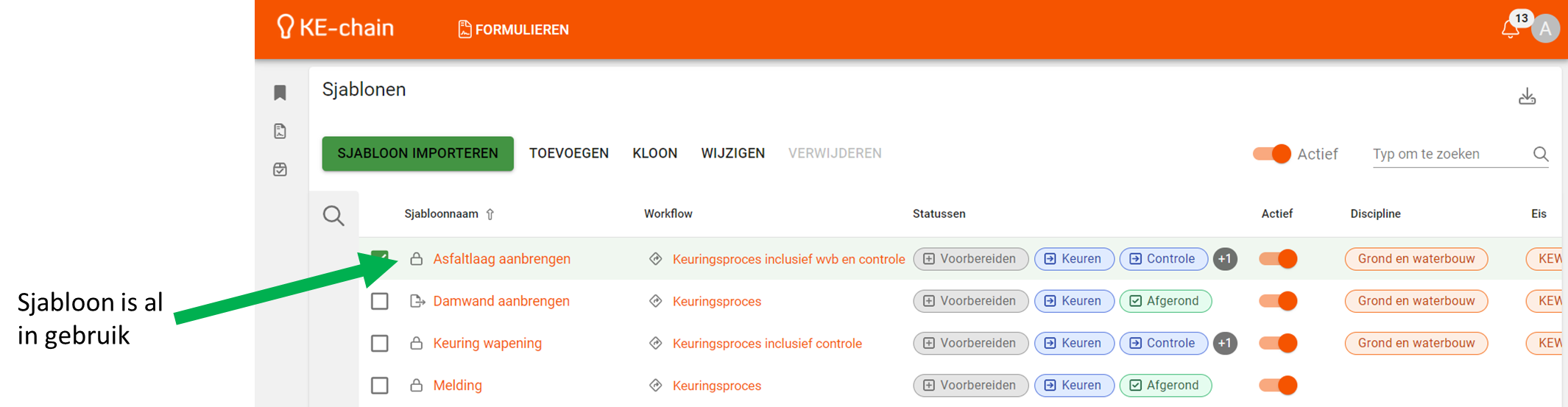 - Wat betekent het vinkje 'actief' bij sjablonen en workflows?