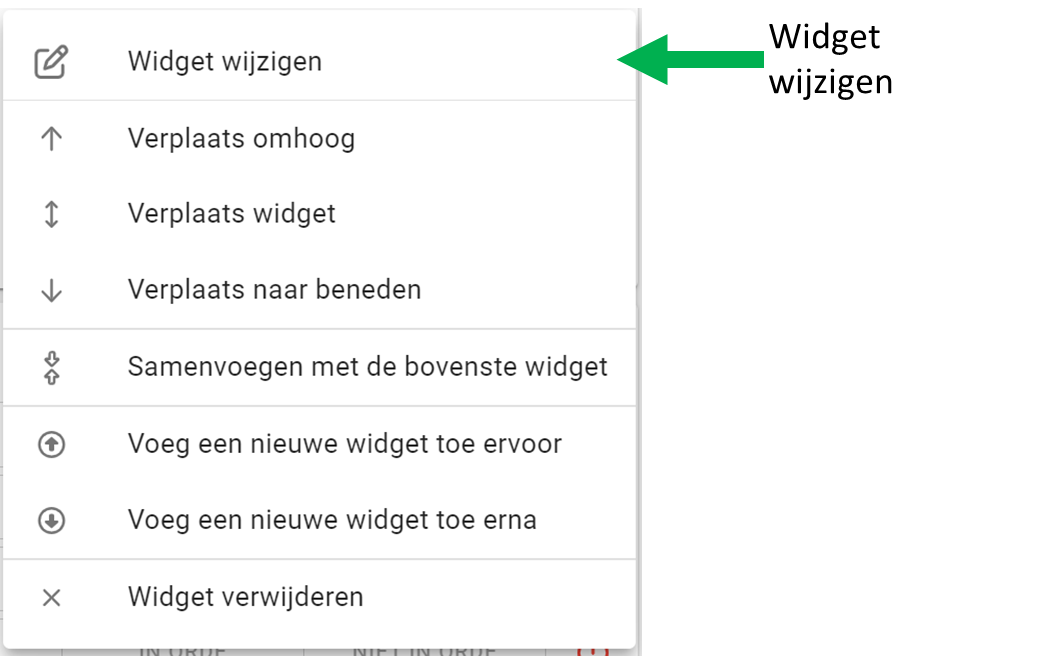 Bestaande widgets kun je wijzigen of verwijderen door op de drie puntjes te klikken. Hierna kun je de layout aanpassen of nieuwe gegevens verstrekken (eigenschappen aanpassen of toevoegen).