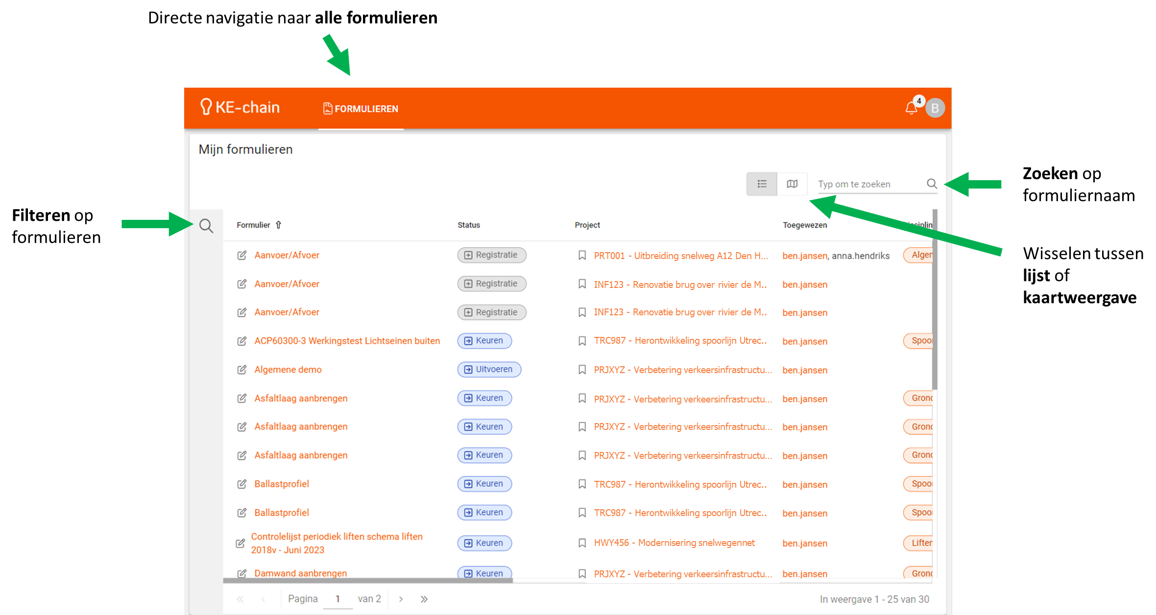 Het formulierenoverzicht over alle projecten: lijstweergave