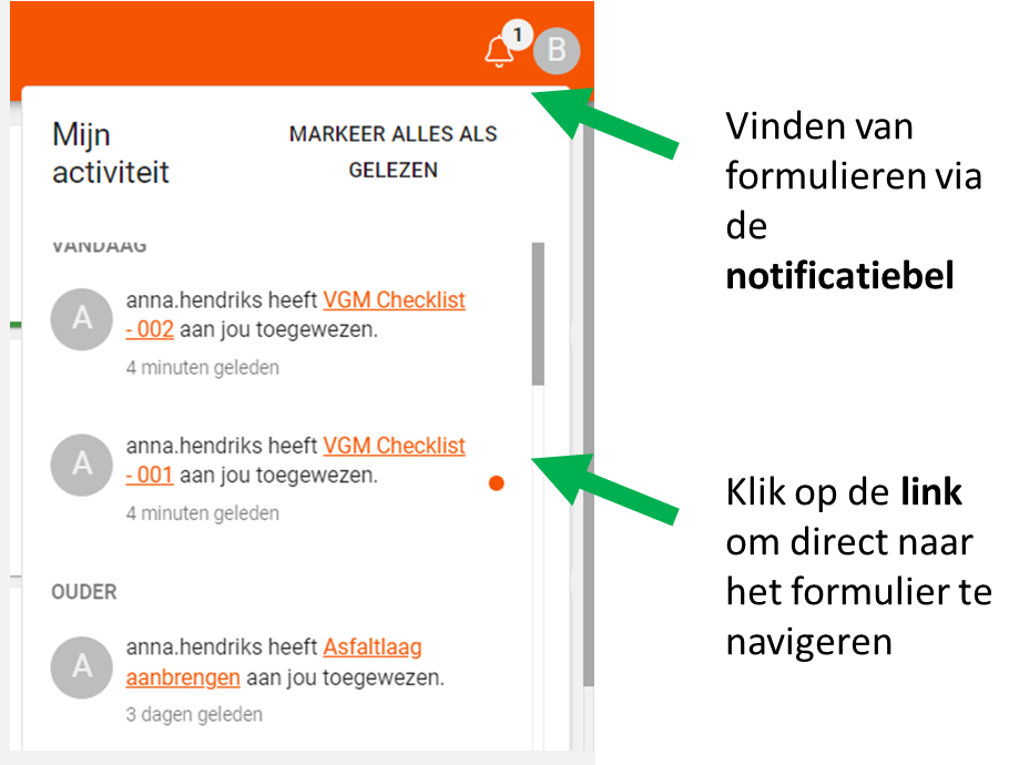 Deze functionaliteit is direct gekoppeld aan uw e-mail . Hierdoor wordt de kans verkleind dat een uitvoerder de melding ontgaat. Na het selecteren van een formulier via de notificatie-bel zal de melding ook verdwijnen. Deze is wel terug te vinden, maar in de praktijk kan het zo zijn dat er in één keer een bulk aan formulieren zijn toegewezen aan één persoon en het overzicht wat verminderd is. Daarom is het handig om de mails van KE-chain van deze meldingen altijd te bewaren (stel hier Outlook-regels voor in: op deze manier worden de mails automatisch in een door u gekozen map geplaatst). Op deze manier kan een uitvoerder altijd eenvoudig in de mail ook zoeken naar het formulier.